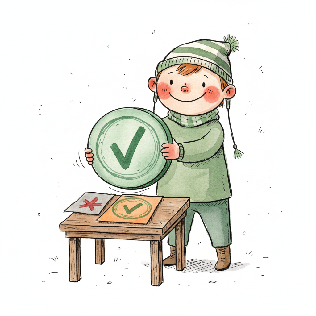 Lachendes Strichmännchen hält grüne Häkchen- und rote X-Schilder hoch.