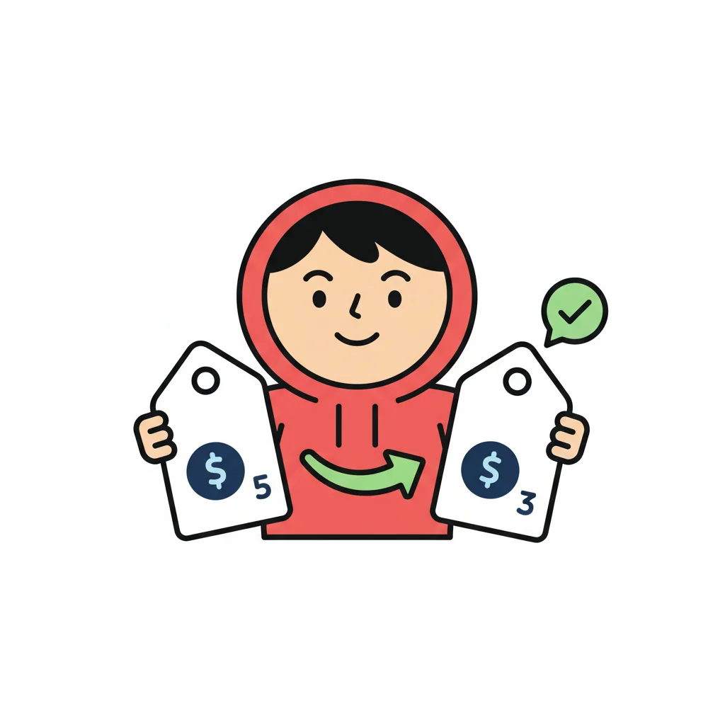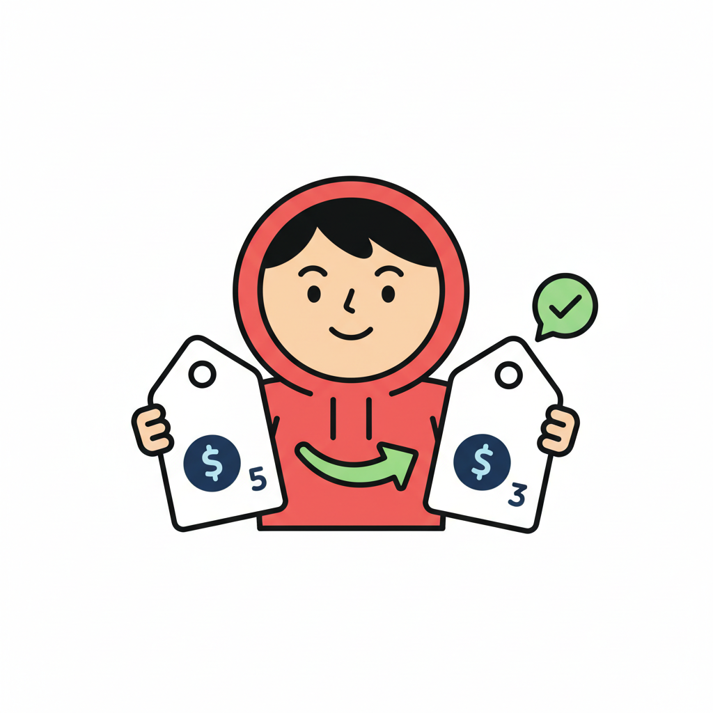 Figur in rotem Hoodie zeigt Preissenkung von $5 auf $3 mit Pfeil und Häkchen.
