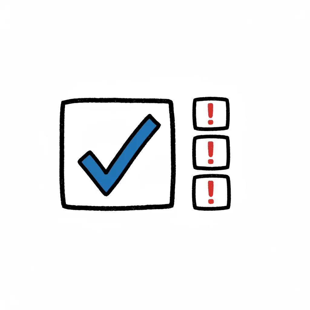 Handgezeichnete Checkliste mit Häkchen, rotem X und leeren Kästchen auf einem Blatt Papier.