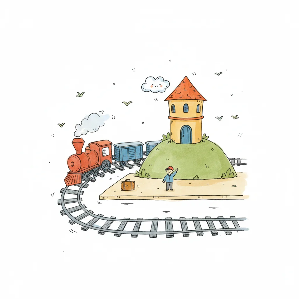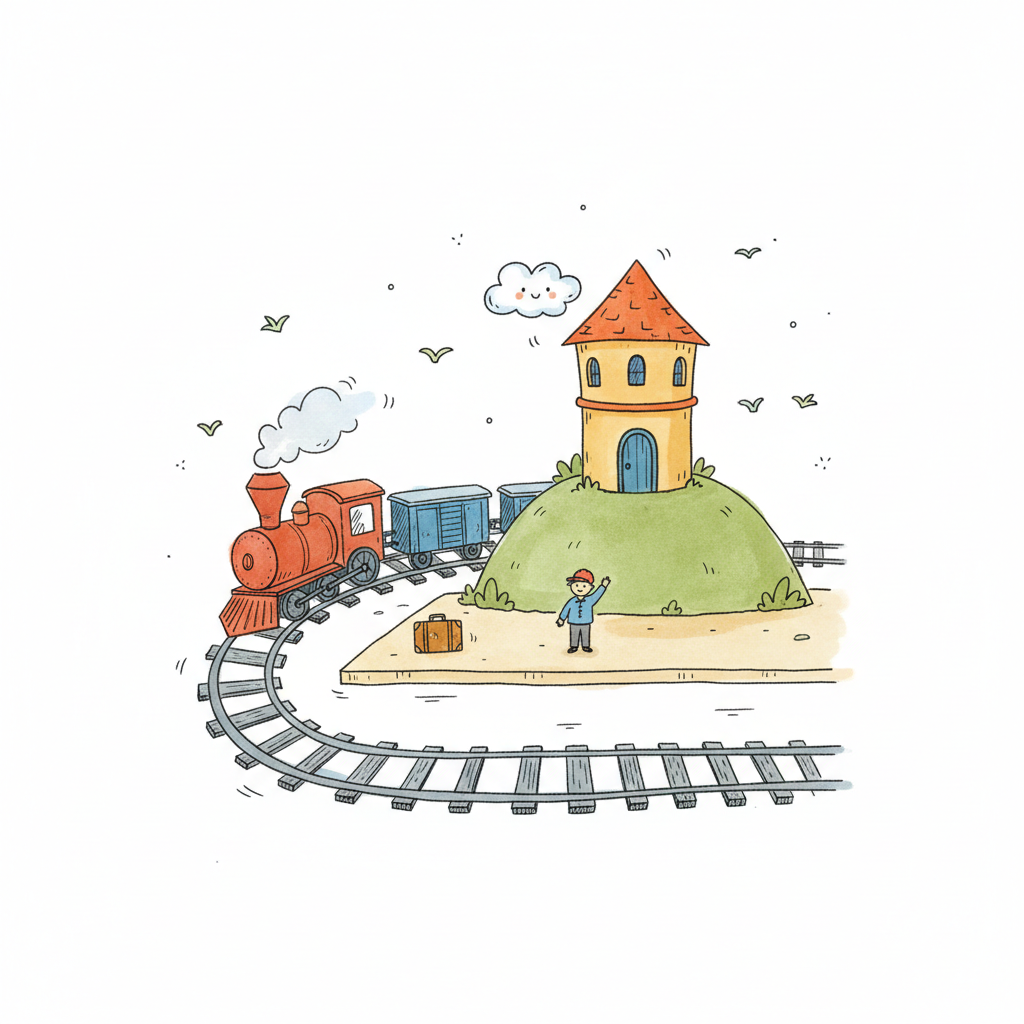 Ein Bahnhof mit einem Zug, einem Hügel und einem kleinen Häuschen.