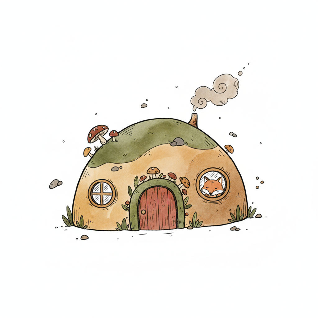 Gemütliche, runde Erdhöhle mit Steineingang, bewachsenem Dach und kleinen Pilzen im Cartoon-Stil.