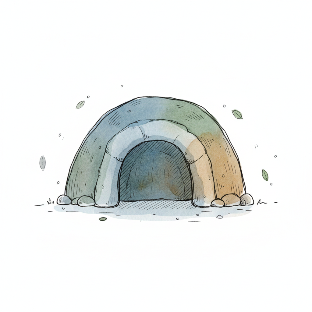 Gezeichneter Höhleneingang aus runden Steinen mit dunklem Inneren und kleinen Pilzen.