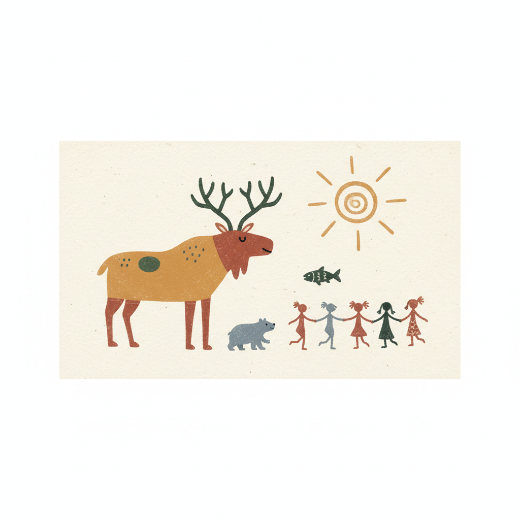 Kindliche Illustration: Elch, Bär, Sonne, Fisch und Mädchen, die Händchen halten.