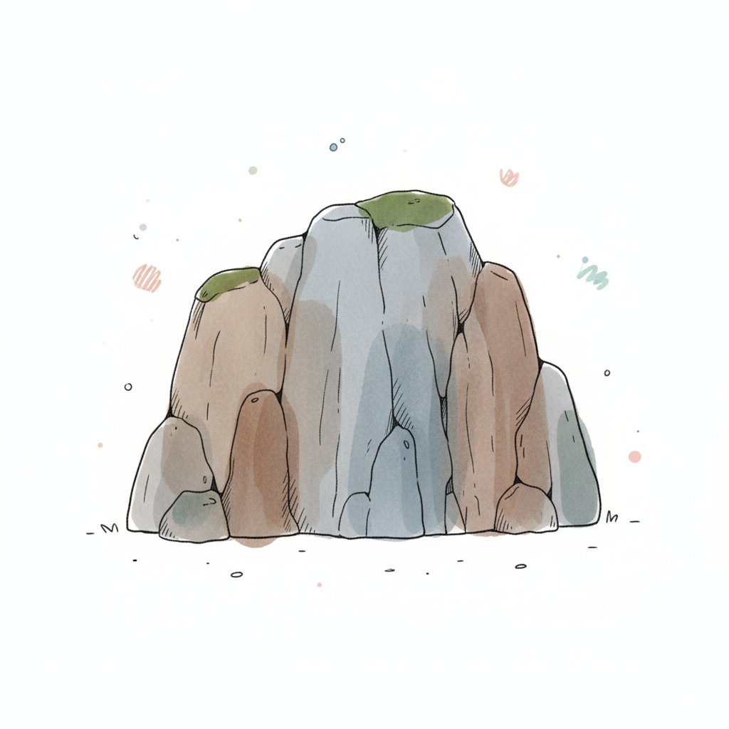 Illustrierte Felsformation mit Moos, gezeichnet im Aquarell-Stil auf weißem Hintergrund.