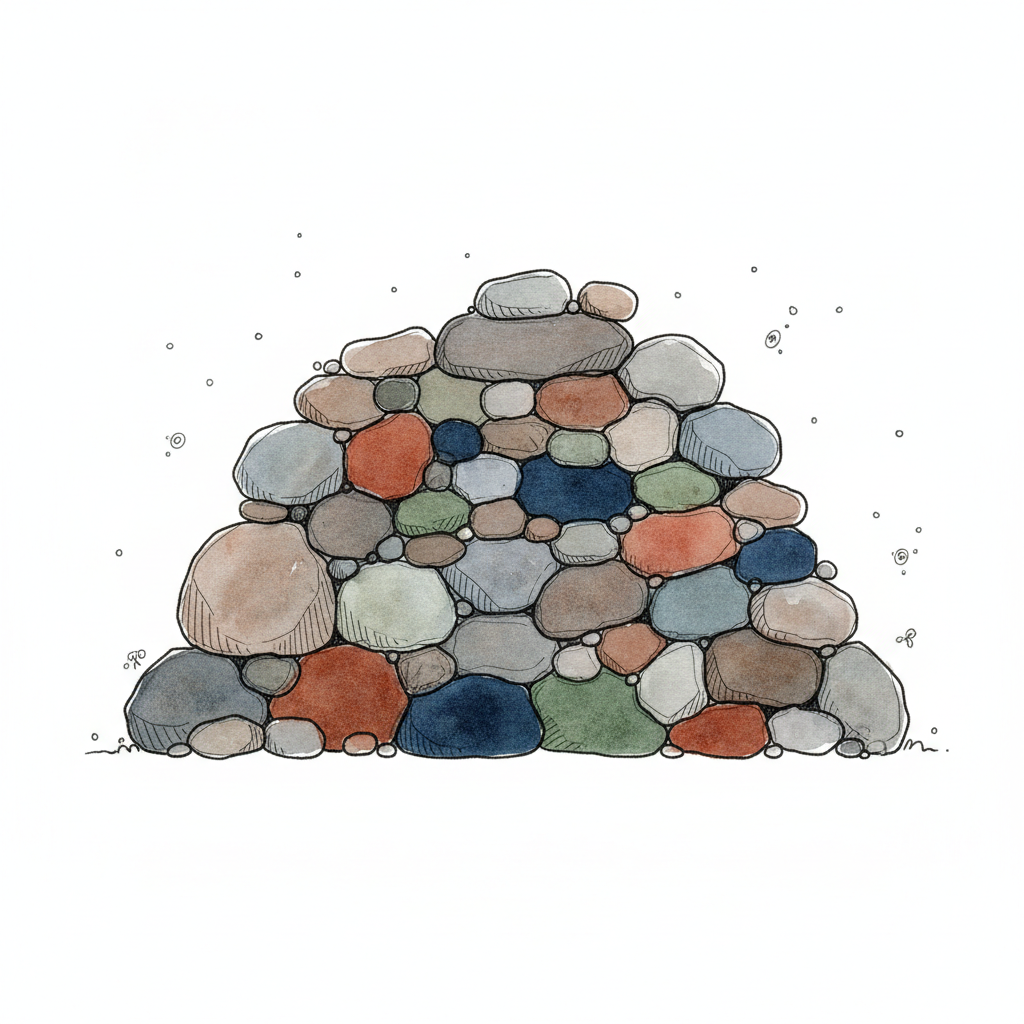 Bunte, runde Steine sind in einer Pyramide gestapelt, im Aquarellstil auf weißem Grund.