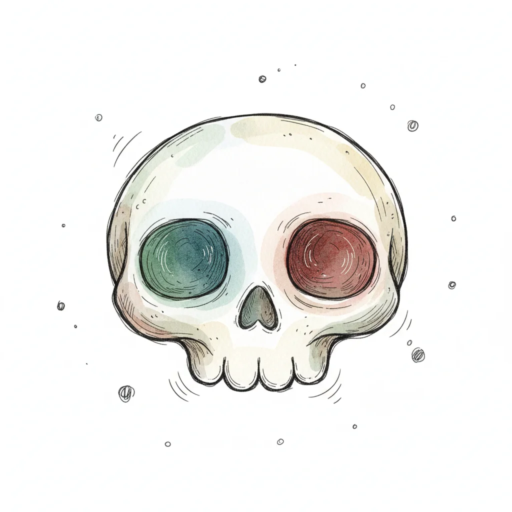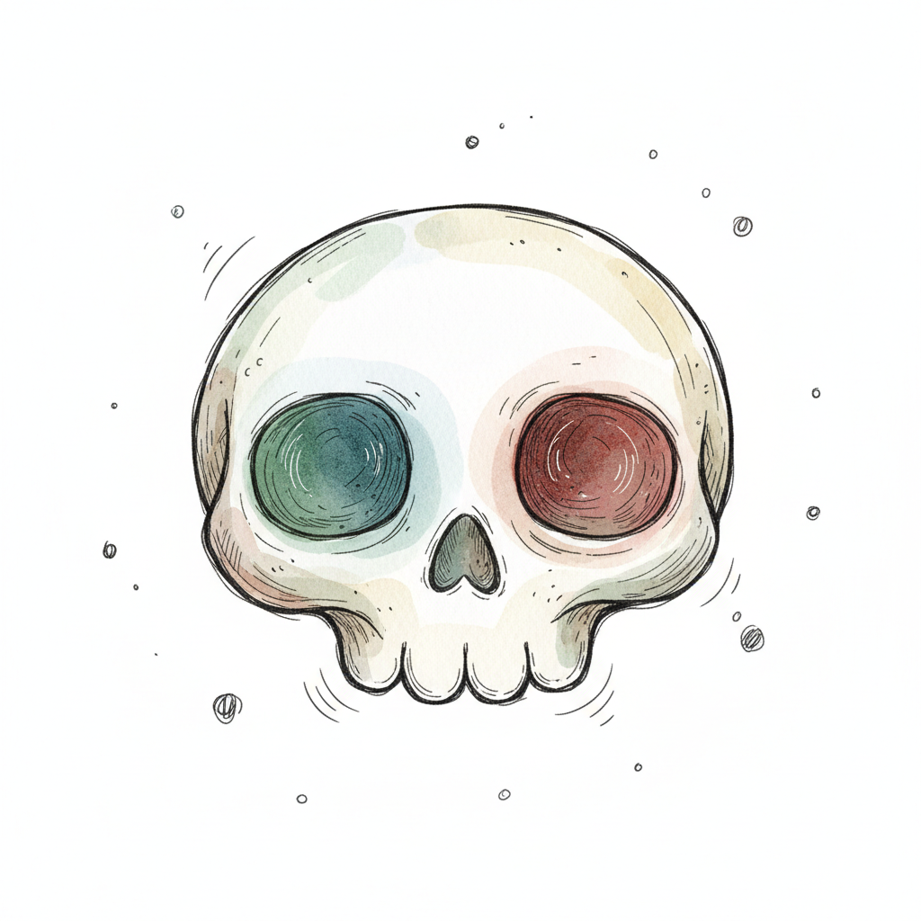 Cartoon-Schädel mit farbigen Augenhöhlen (grün/rot) im Aquarellstil auf weißem Hintergrund.