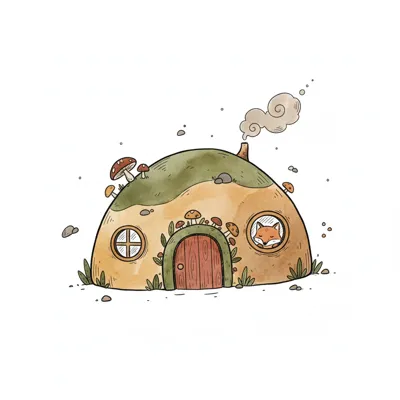 Niedliches Aquarell einer Erdhöhle mit Fuchs, Pilzen und rauchendem Schornstein.