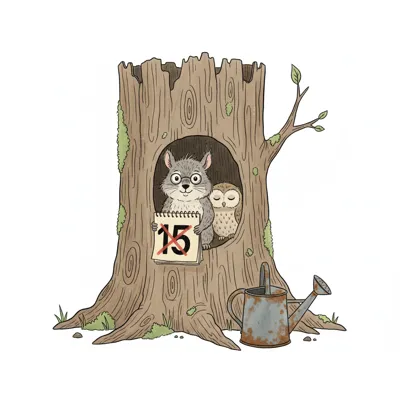 Eichhörnchen mit Brille und Eule in Baumhöhle, Eichhörnchen hält Kalenderblatt mit durchgestrichener 15.