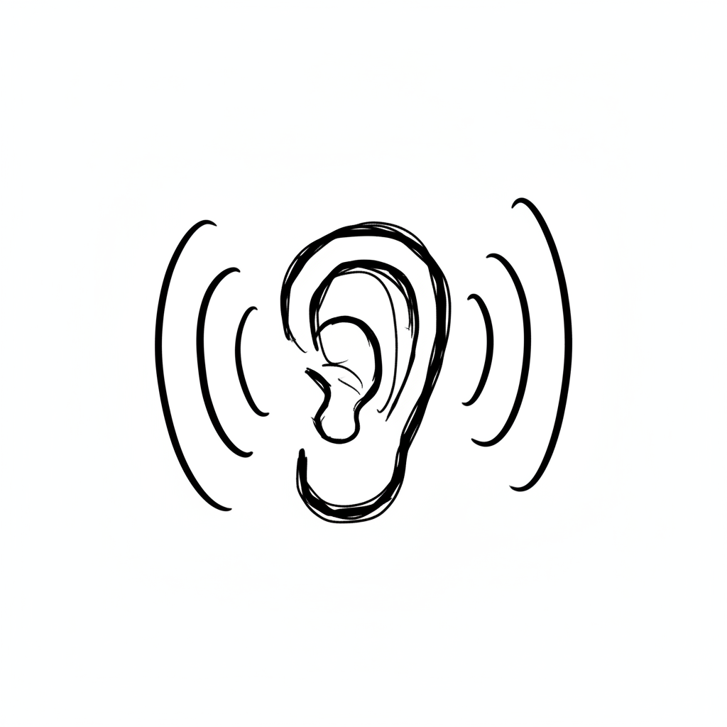 Skizze eines Ohres mit Schallwellen, symbolisiert Hören, Zuhören oder Akustik.