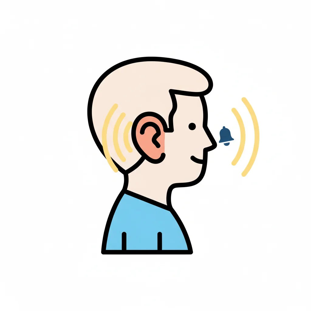 Person hört einen Klingelton, dargestellt durch eine Glocke und Schallwellen am Ohr.