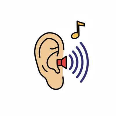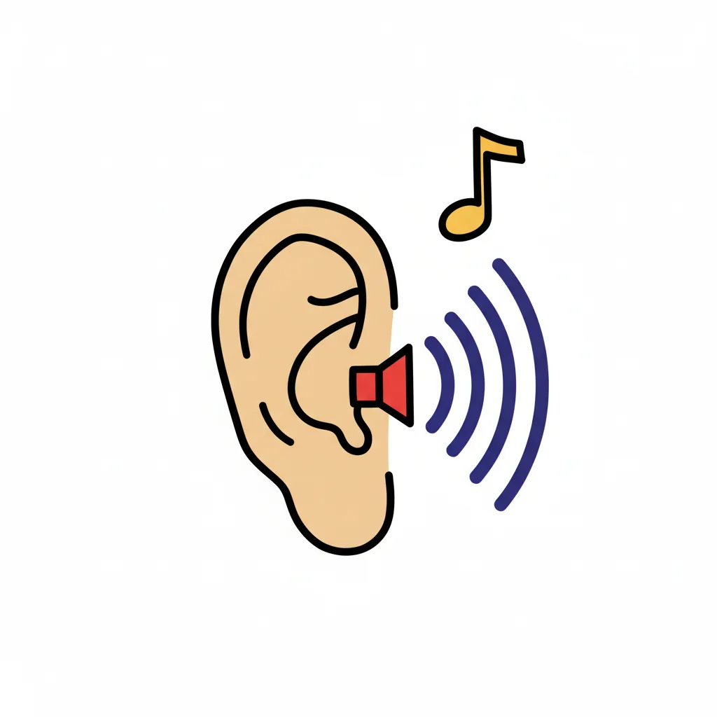 Ein Ohr empfängt Töne von einem Lautsprecher, begleitet von einer Musiknote.