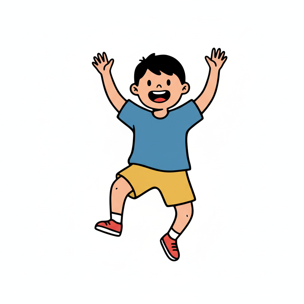Ein fröhlicher Junge springt in die Luft mit erhobenen Händen.
