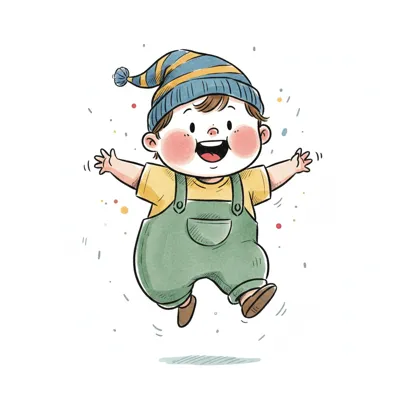 Ein fröhliches Kind in Latzhose springt begeistert.