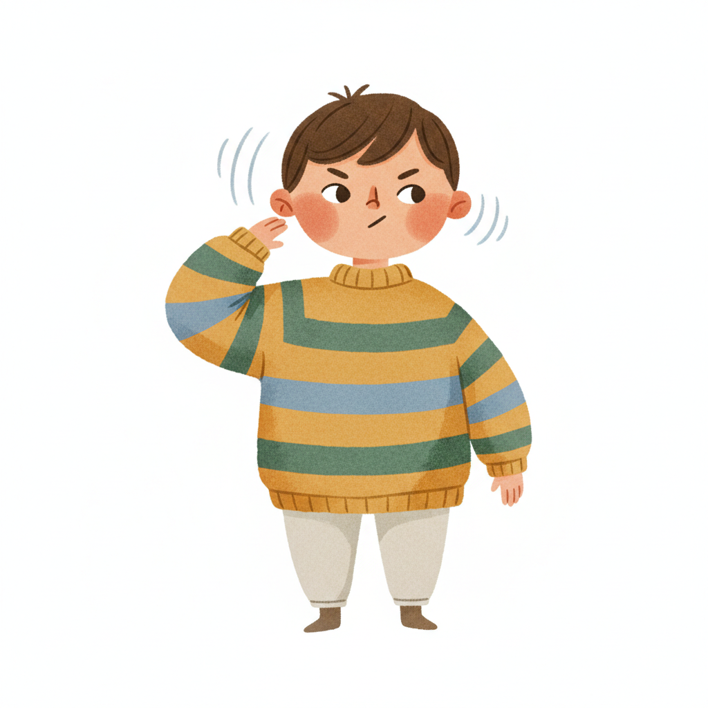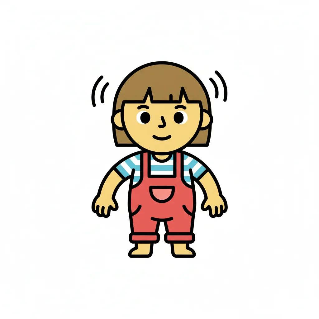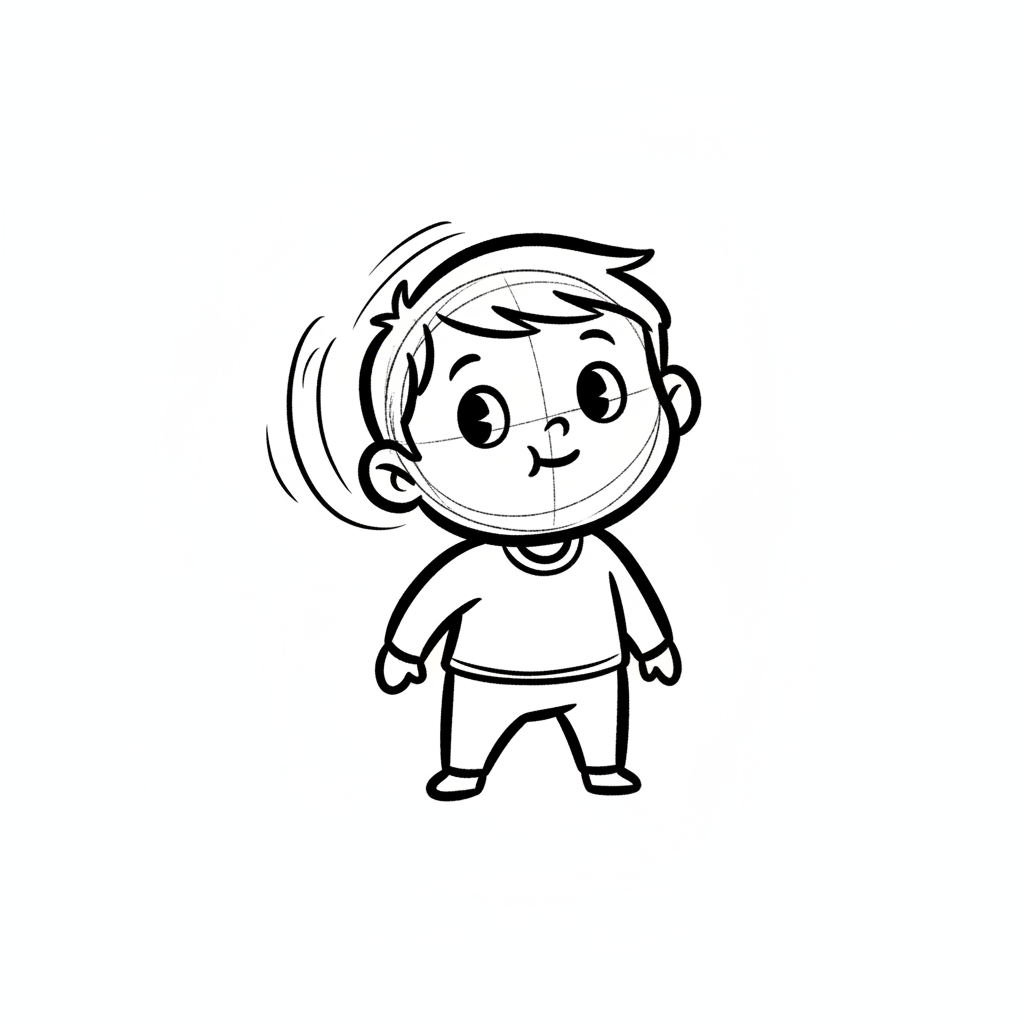 Handgezeichnete Kinderbuchillustration im modernen skandinavisch-nordischen Stil. Minimalistische, freundliche Figur mit einfachen Formen und leicht unregelmäßigen, handgezeichneten Linien. Ruhige, gedeckte Farbpalette, viel freie Fläche, reduzierte Details, sanfte Papier- oder Aquarellstruktur. Warme, ruhige, leicht humorvolle Stimmung, flächige Komposition ohne starke Perspektive, moderner nordischer Illustrationsstil, charmant und zeitlos.