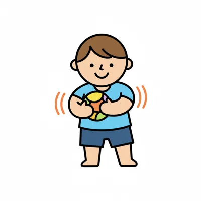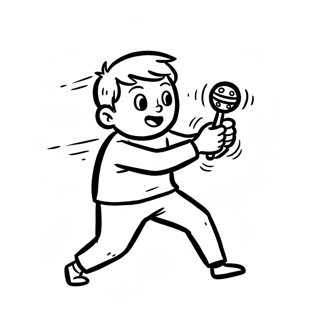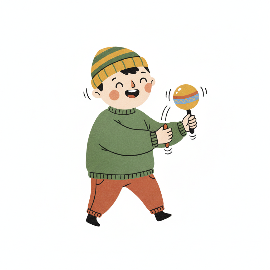 Ein Jungen, der begeistert eine Rassel schwingt.