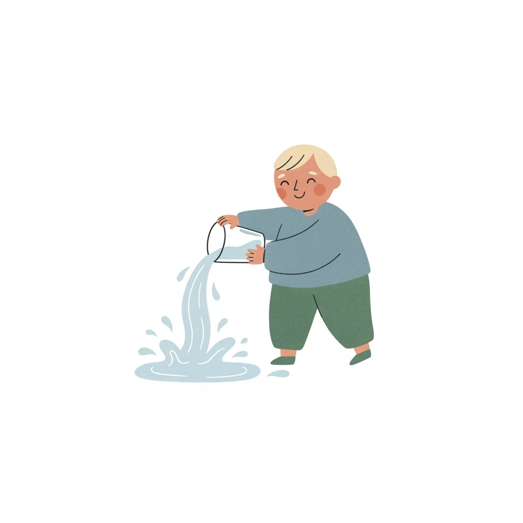 Ein Junge gießt Wasser aus einem Behälter und spritzt dabei.