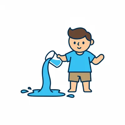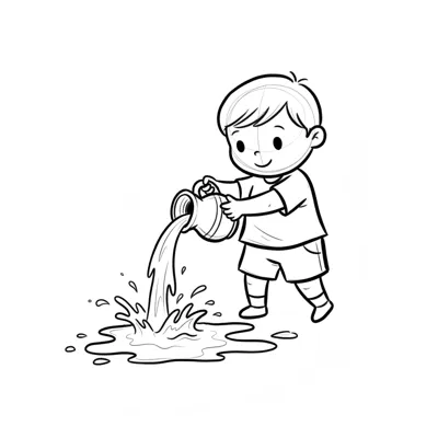 Ein Junge gießt Wasser aus einem Eimer und macht eine Sauerei.