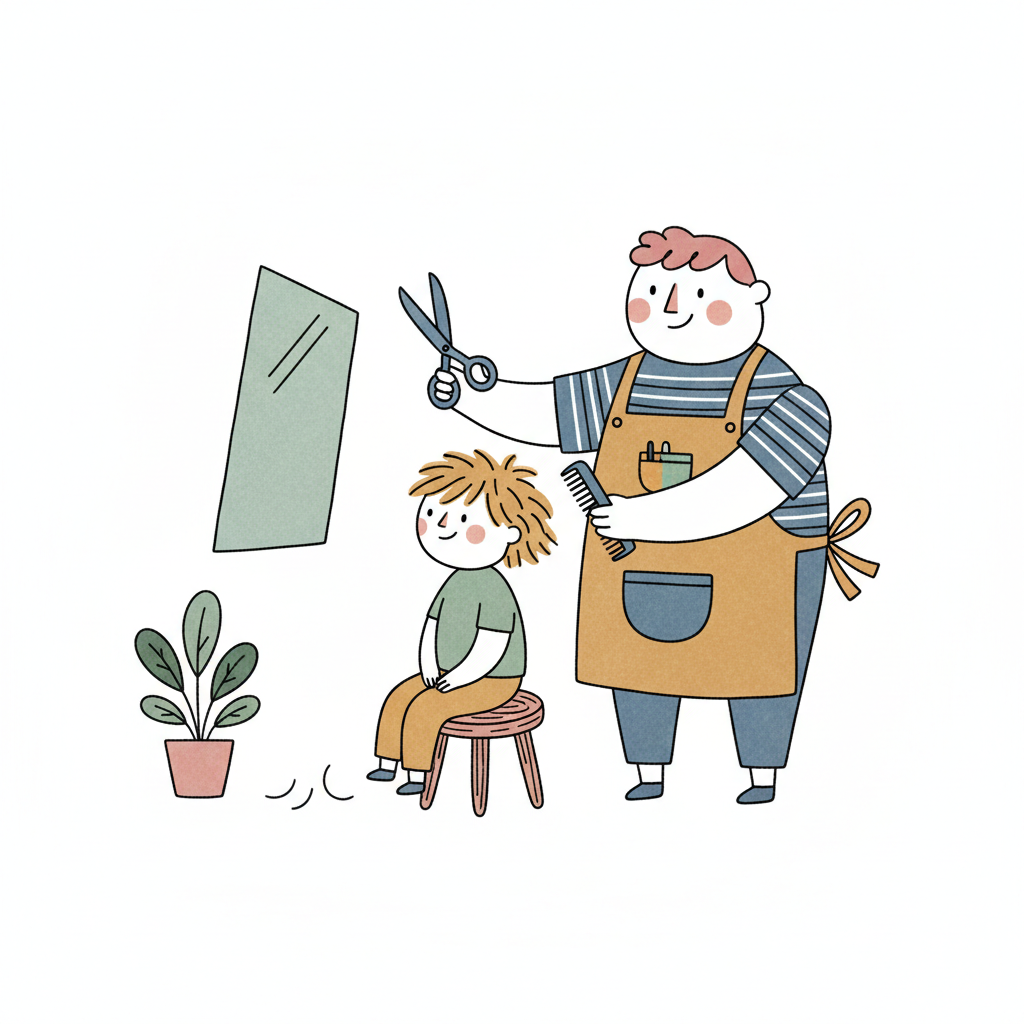 Ein Friseur schneidet einem Jungen die Haare vor einem Spiegel.