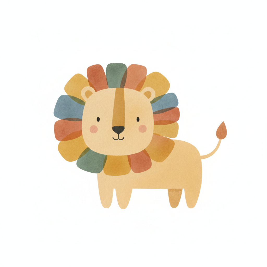 Kawaii-Stil Löwe mit buntem Mähnen-Haar und freundlichem Gesichtsausdruck.