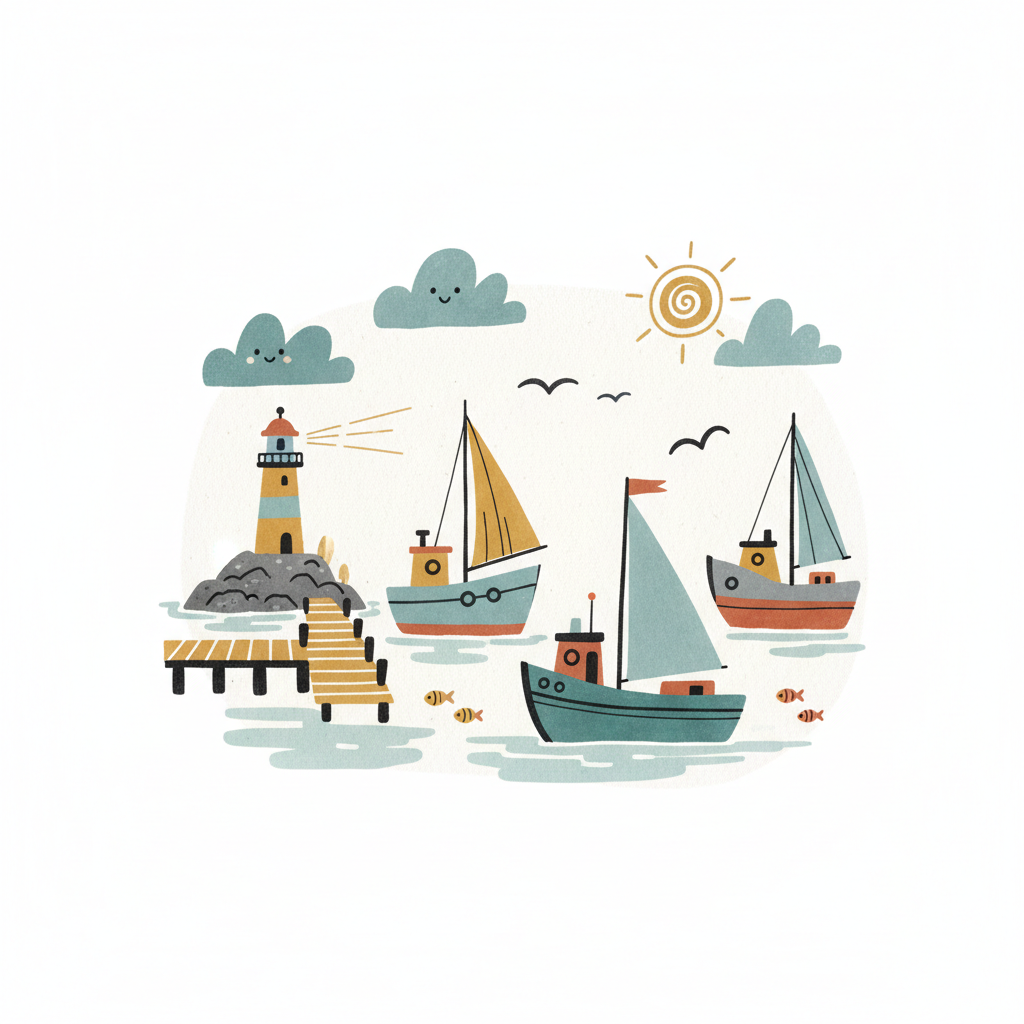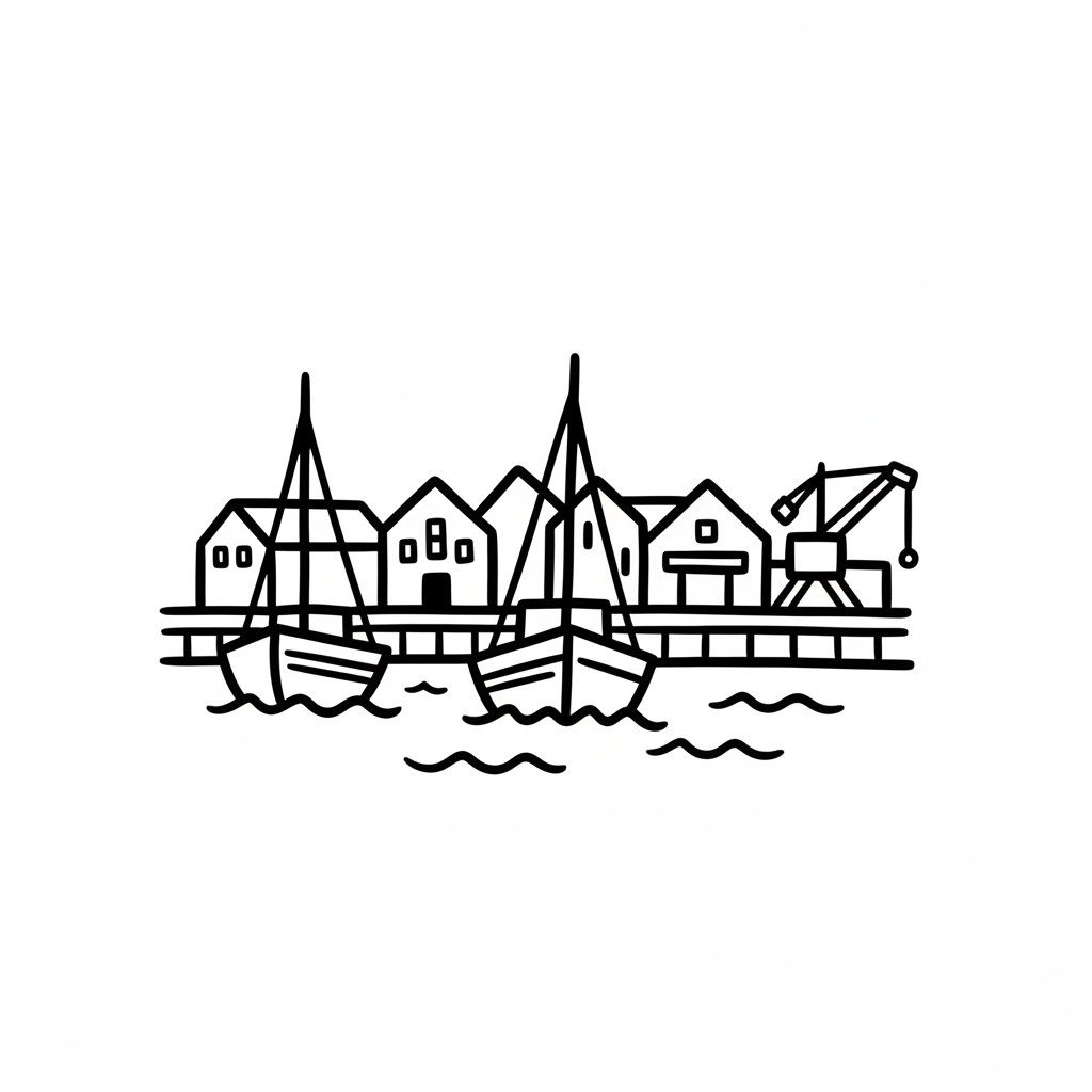 Häfen mit Booten und einem Kran am Ufer in einfacher Zeichnung.