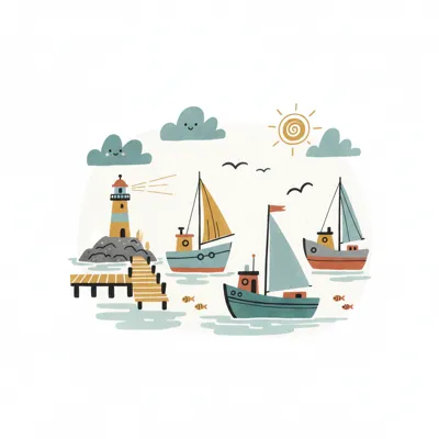 Idyllische Hafenlandschaft mit Booten und Leuchtturm, umgeben von Wolken und Sonne.