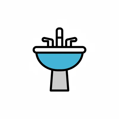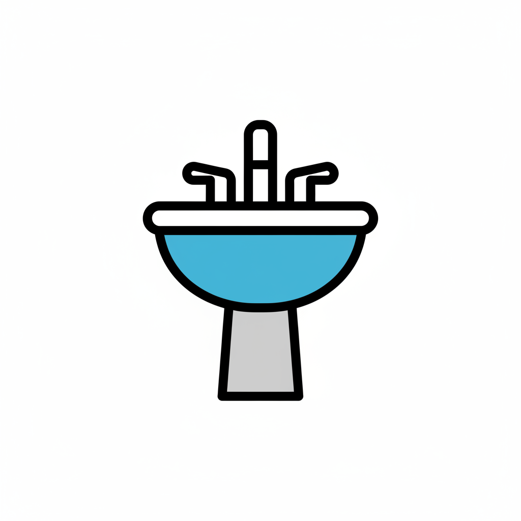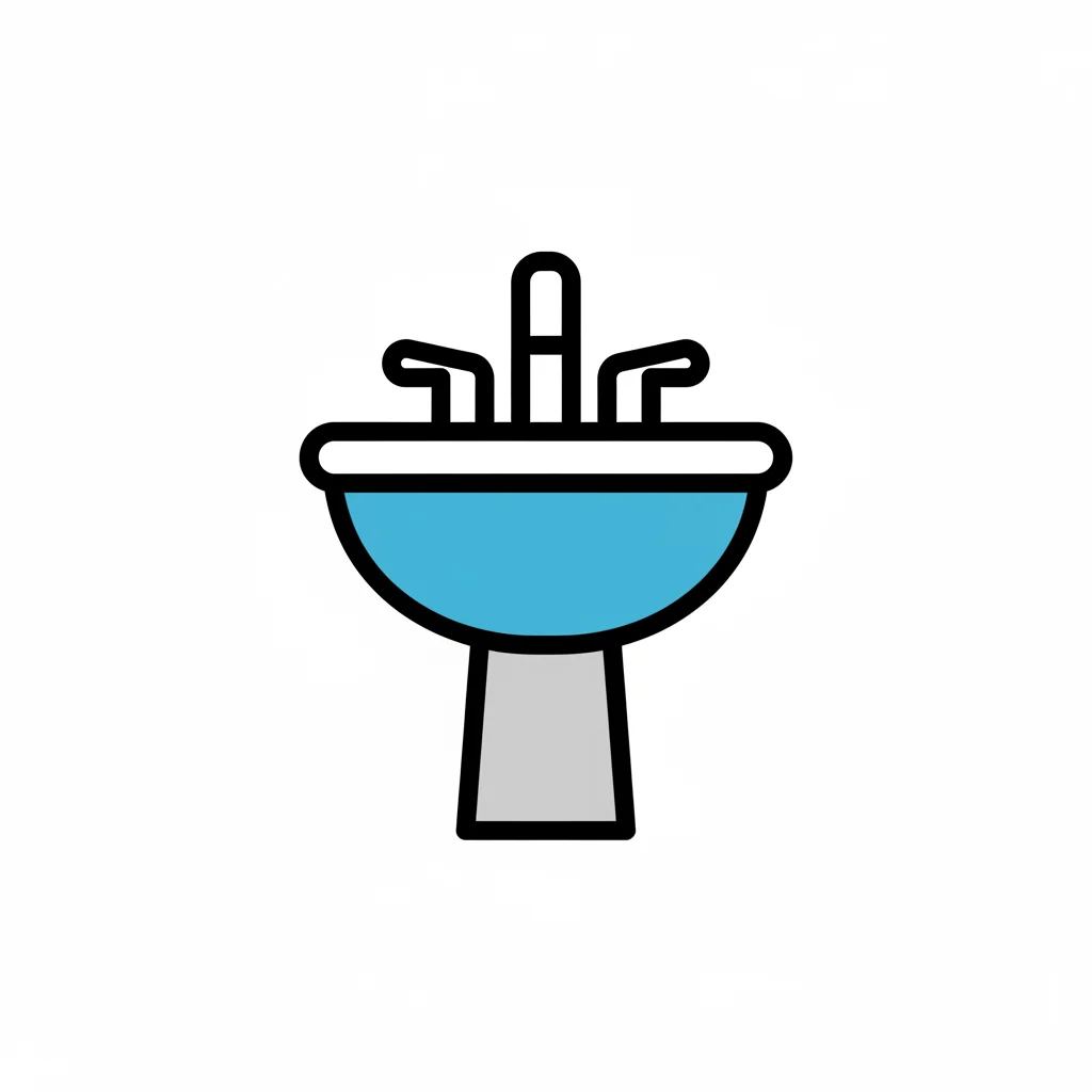 Ein stilisierter Waschtisch mit Wasserhahn und blauem Becken.