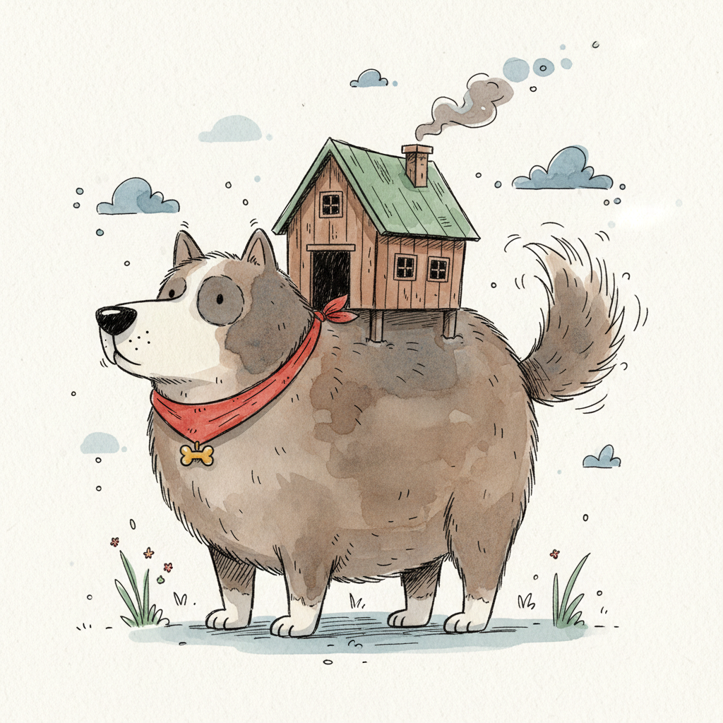 Ein flauschiger Hund mit rotem Halstuch trägt ein kleines Haus mit rauchendem Schornstein auf dem Rücken.