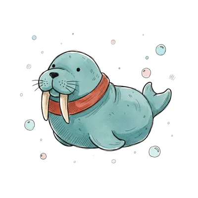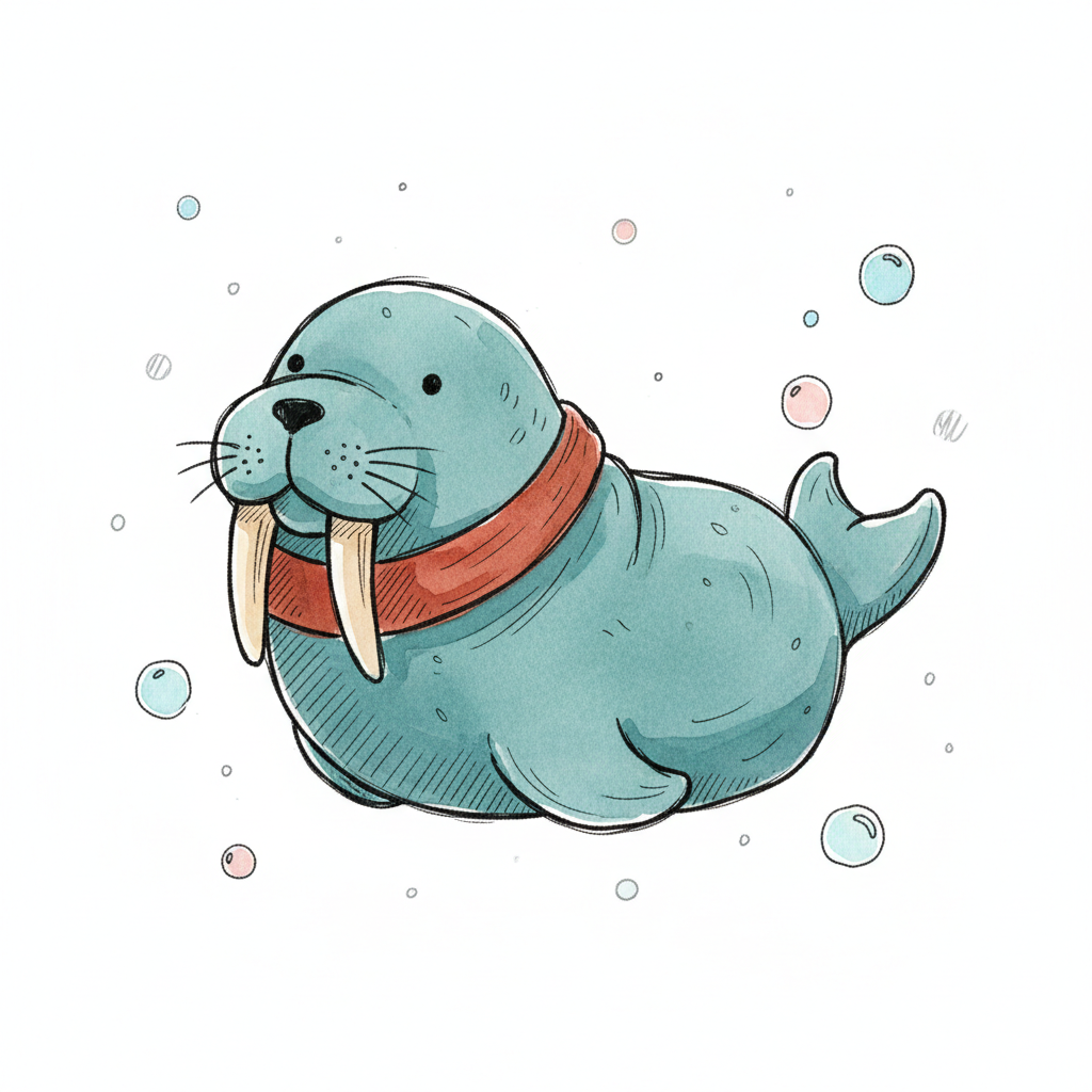 Niedliches, blaues Walross mit rotem Halstuch und Stoßzähnen, umgeben von Blasen.