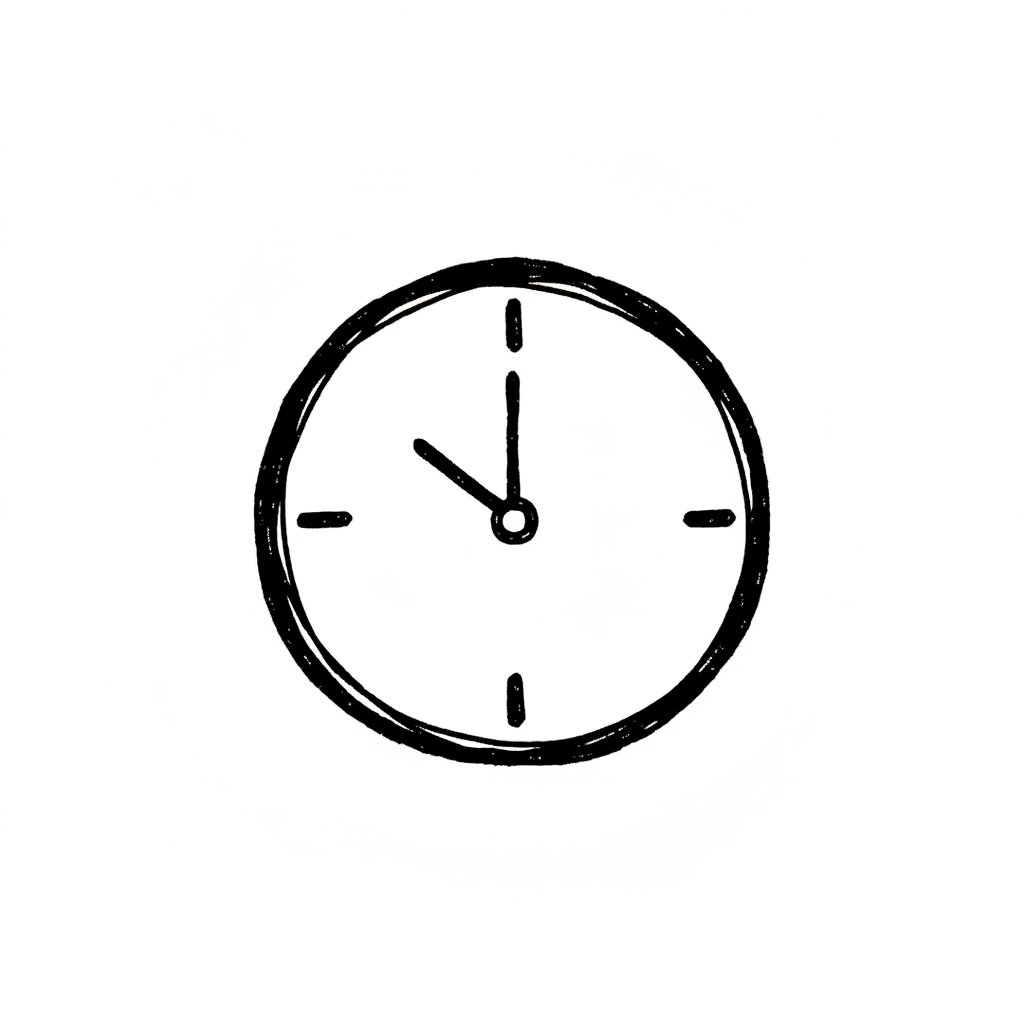 Ein einfaches, handgezeichnetes Uhrensymbol mit Zeigern.