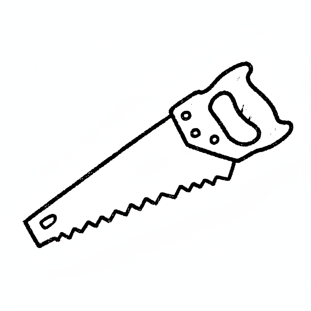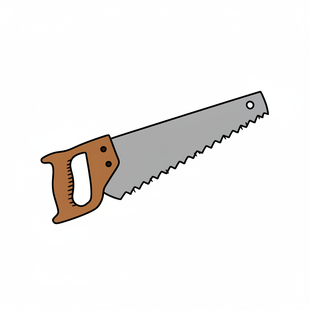 Eine gezeichnete Handsäge mit braunem Griff und grauer Klinge auf weißem Hintergrund.