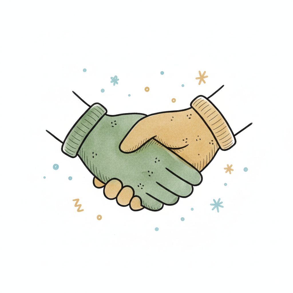 Zwei Hände schütteln sich in einem freundlichen, aquarellartigen Stil, umgeben von Sternen.
