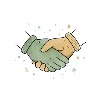 Zwei behandschuhte Hände schütteln sich in einer freundlichen Geste, umgeben von kleinen Dekorationen.