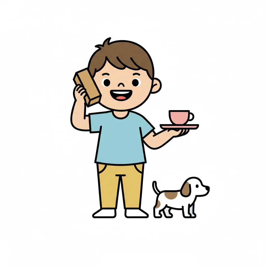 Ein Junge mit einem Handy und einer Tasse, daneben ein Hund.