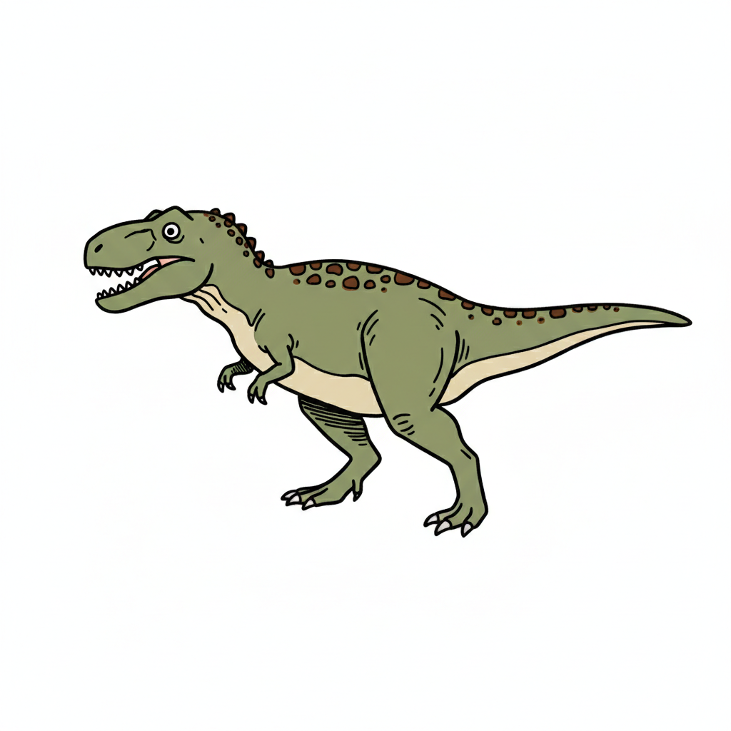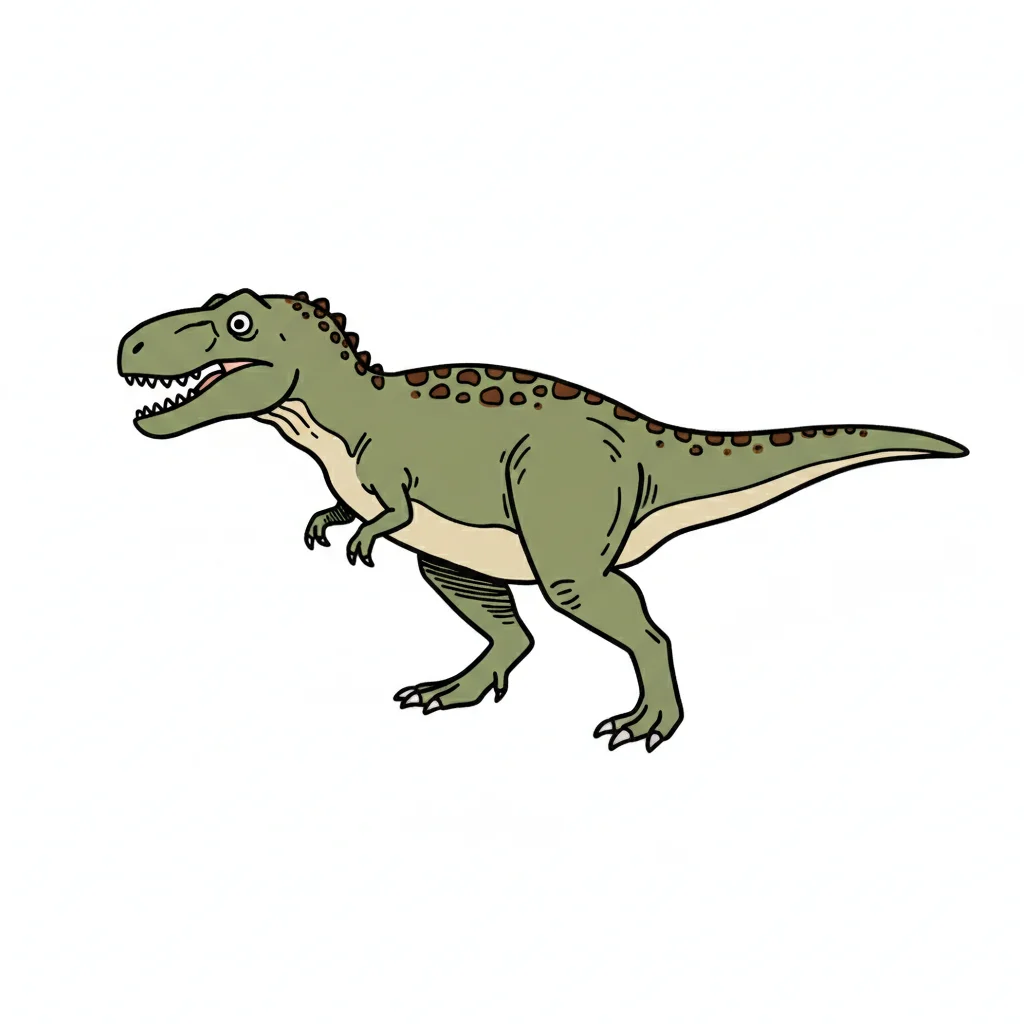 Grüner Cartoon-Dinosaurier mit braunen Flecken und scharfen Zähnen auf weißem Hintergrund.