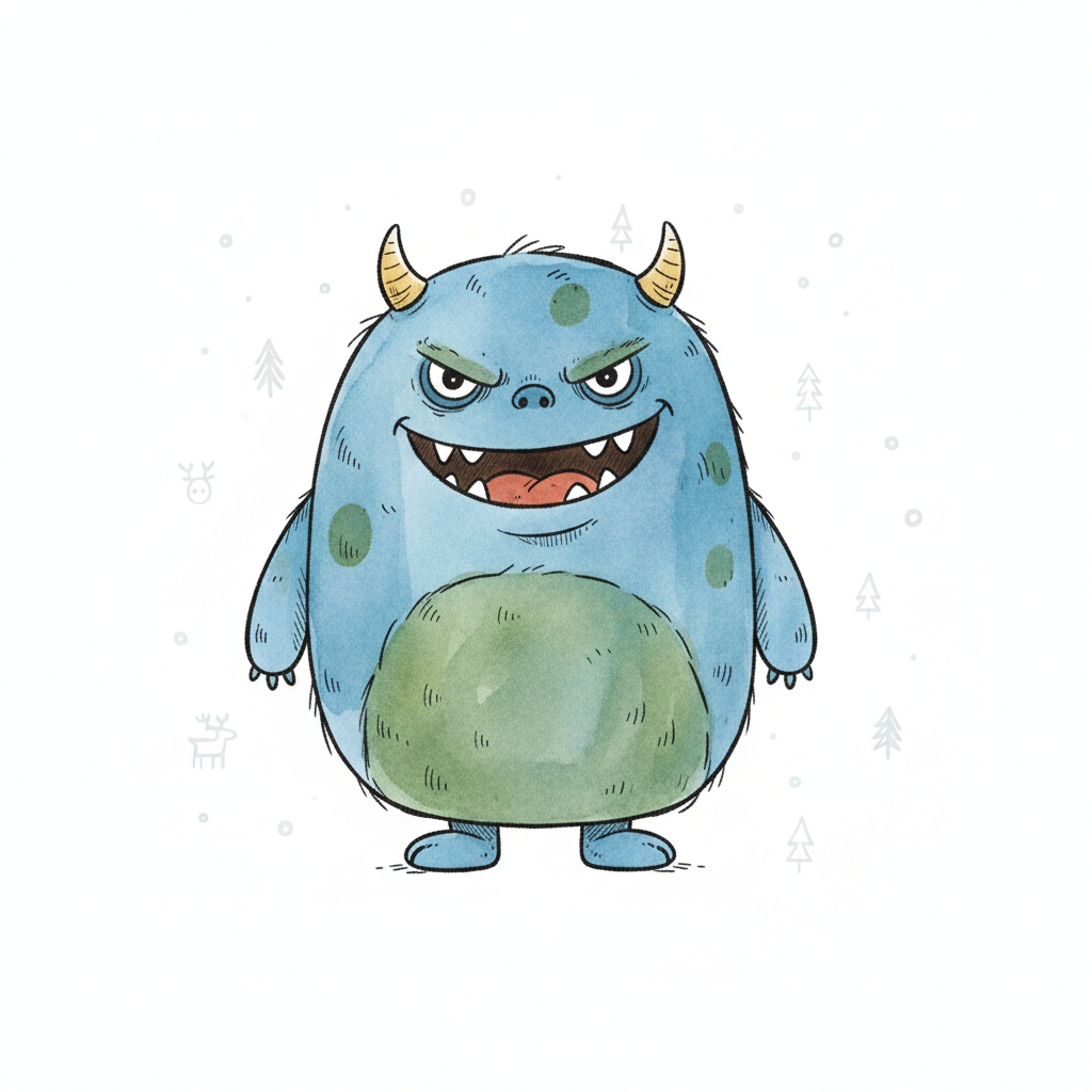 Blaues, rundes Monster mit Hörnern, scharfen Zähnen und bösem Grinsen im Aquarellstil.