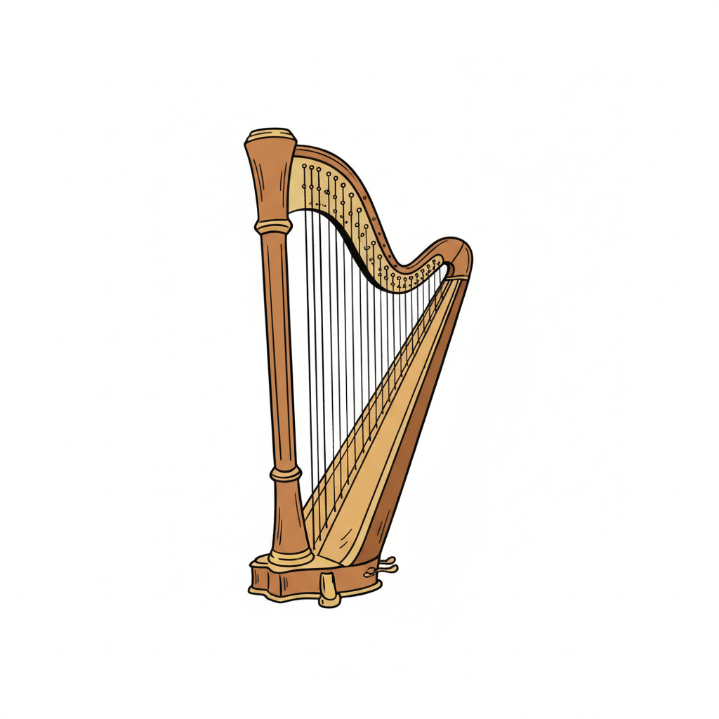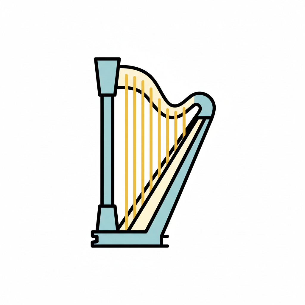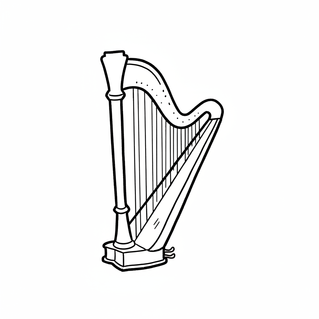 Stilisierte Schwarz-Weiß-Zeichnung einer Harfe, einem klassischen Musikinstrument.