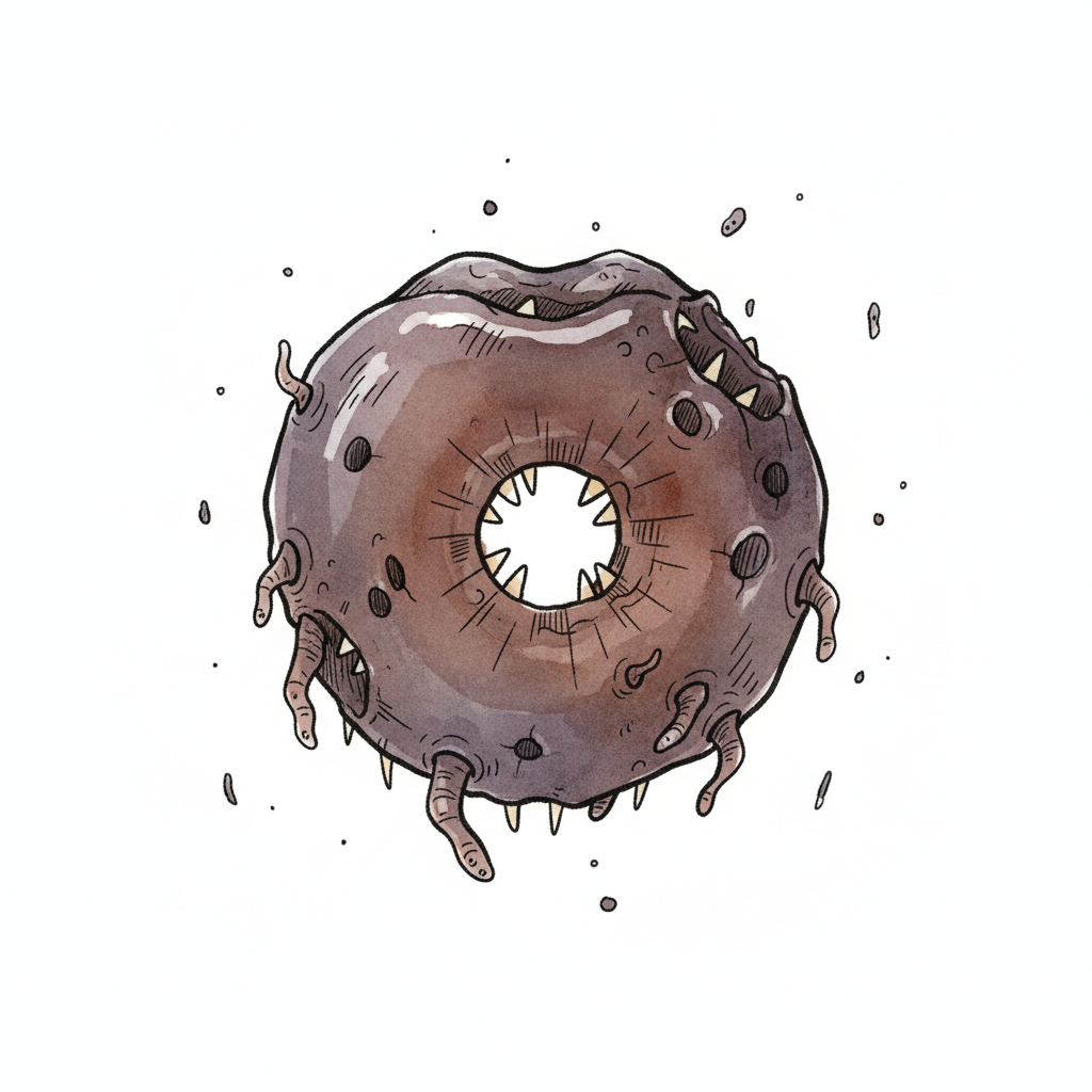 Gruseliger, brauner Donut mit scharfen Zähnen und kleinen Tentakeln, schwebend in Aquarell.