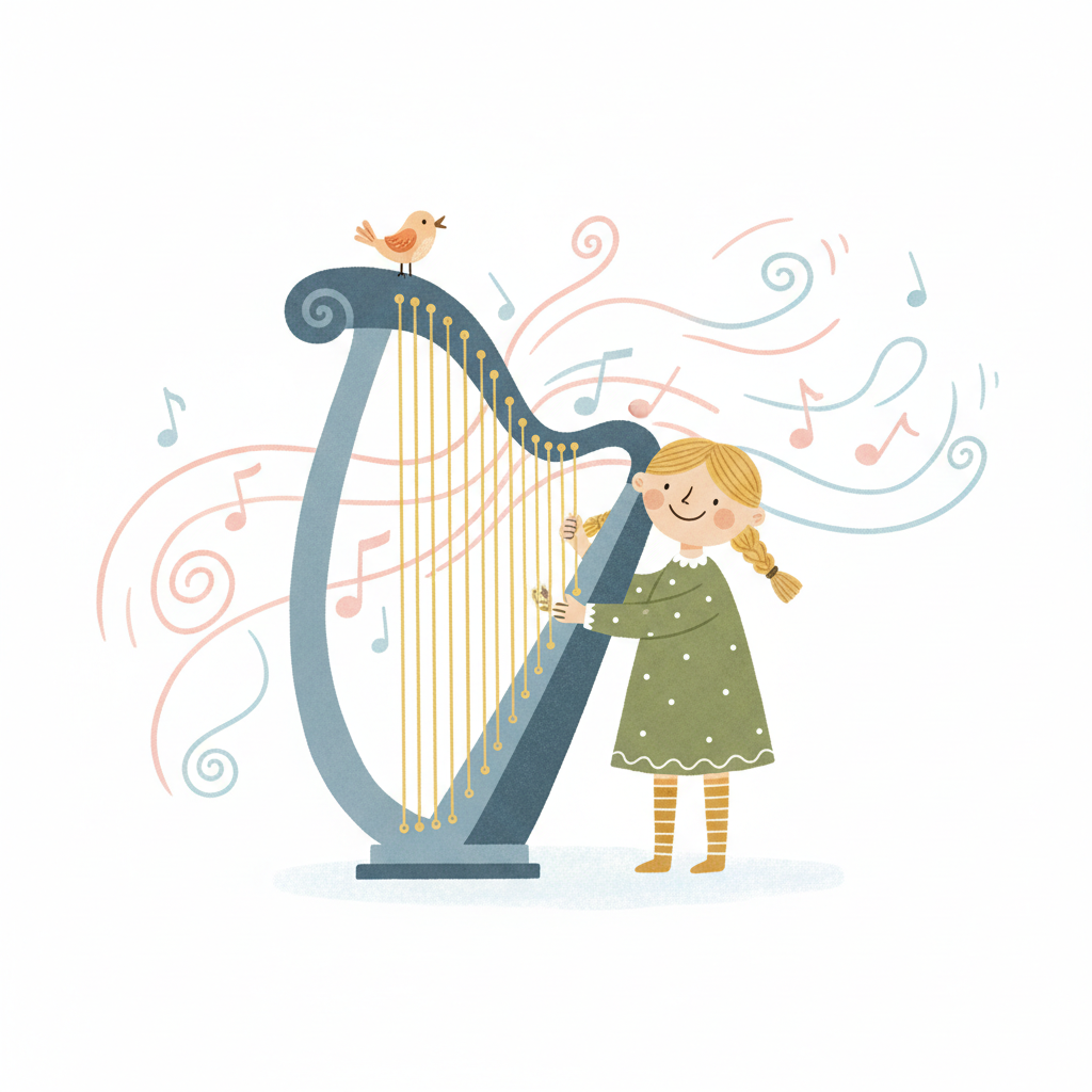 Ein lächelndes Mädchen spielt Harfe, während ein Vogel darauf singt. Musiknoten schweben umher.