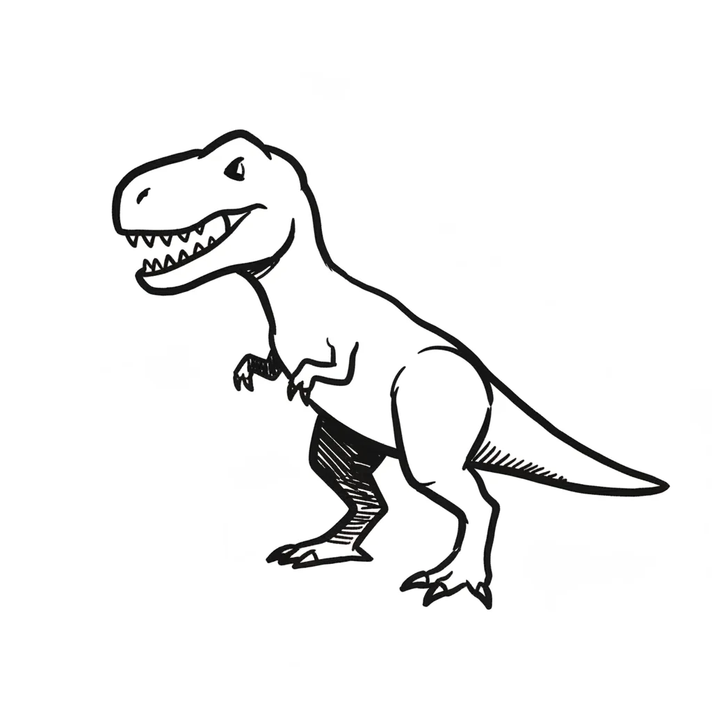 Schwarz-weiße Strichzeichnung eines lächelnden Cartoon-T-Rex mit scharfen Zähnen und kleinen Armen.
