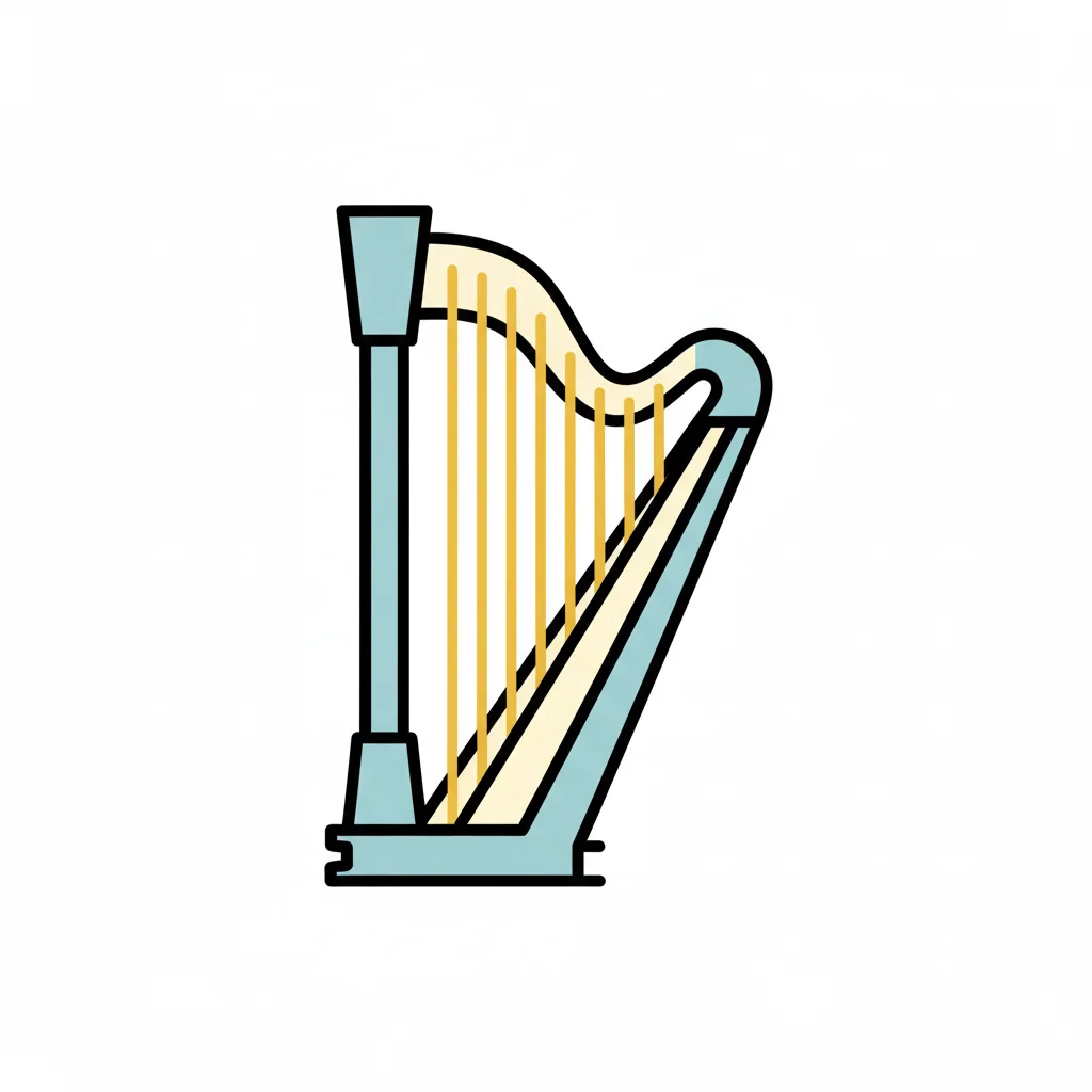 Stilisierte Illustration einer Harfe mit hellblauem Rahmen und goldenen Saiten auf weißem Hintergrund.