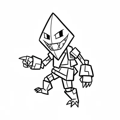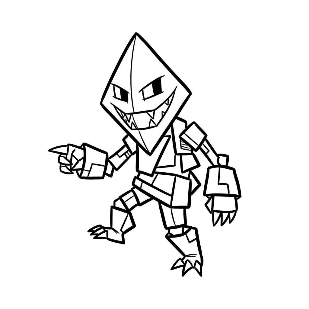 Ein grinsender, geometrischer Roboter mit spitzem Kopf und scharfen Zähnen zeigt mit dem Finger.