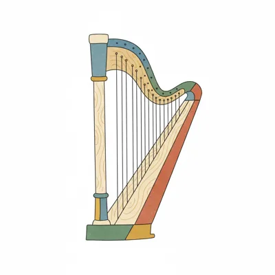Stilisierte Harfe mit farbigen Akzenten und Holzmaserung, isoliert auf Weiß.