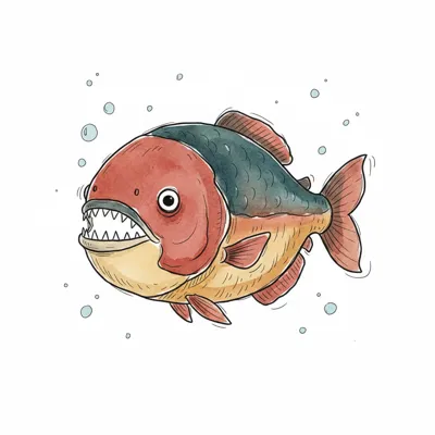 Ein cartoonartiger Fisch mit scharfen Zähnen und buntem Körper.