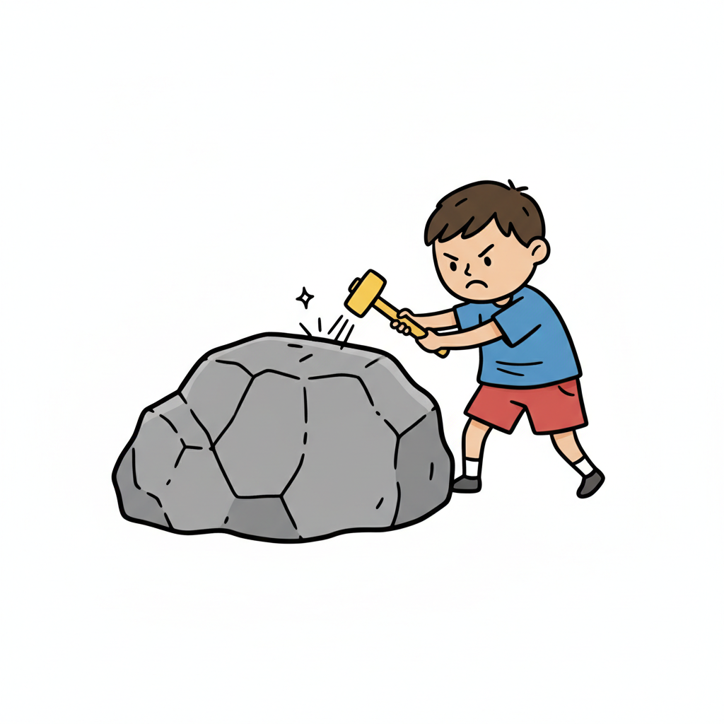 Ein wütender Junge schlägt mit einem Hammer auf einen Felsen, Funken sprühen.