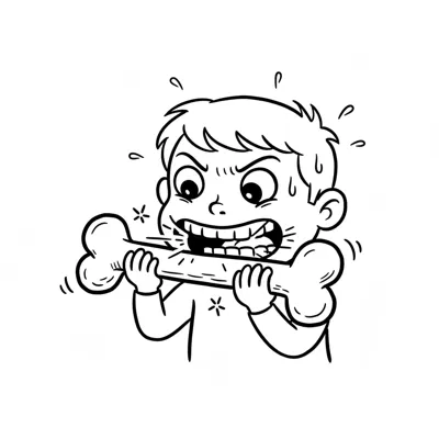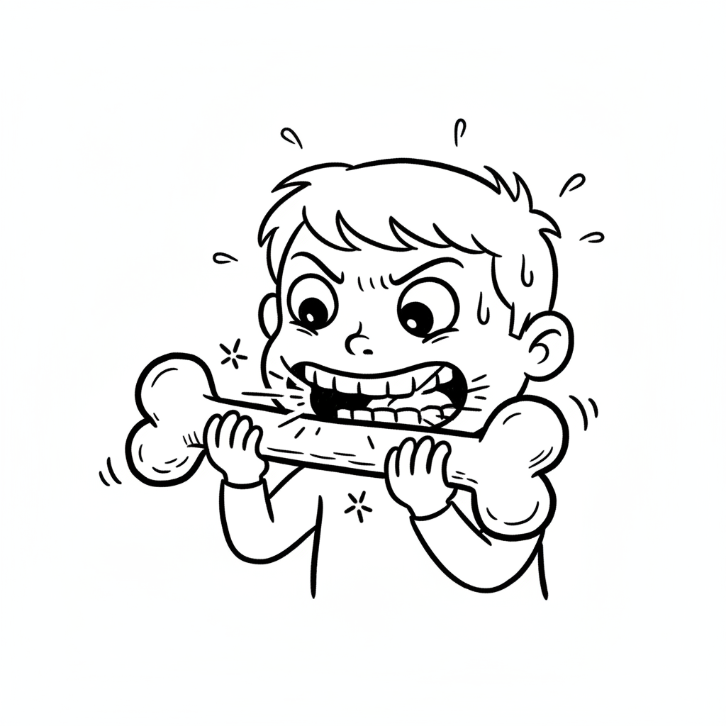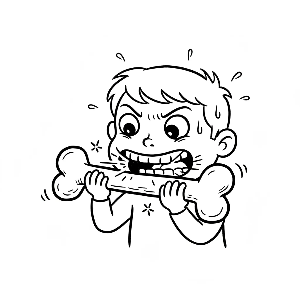 Cartoonjunge beißt mit Anstrengung in einen großen Knochen, schwitzt dabei.