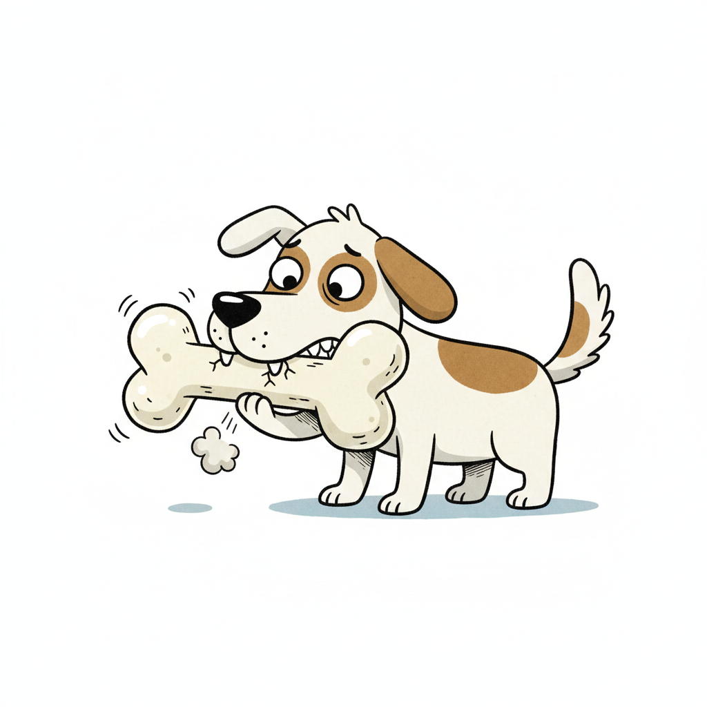 Ein Cartoon-Hund mit braunen Flecken trägt mühsam einen riesigen Knochen in seinem Maul.