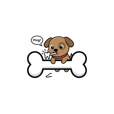Ein süßer Welpe hält einen glänzenden Zahn im Maul und schaut über einen Knochen. "Ping!".