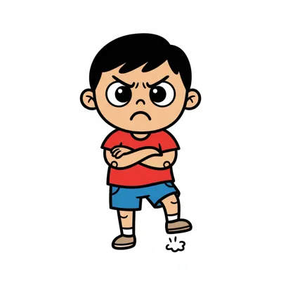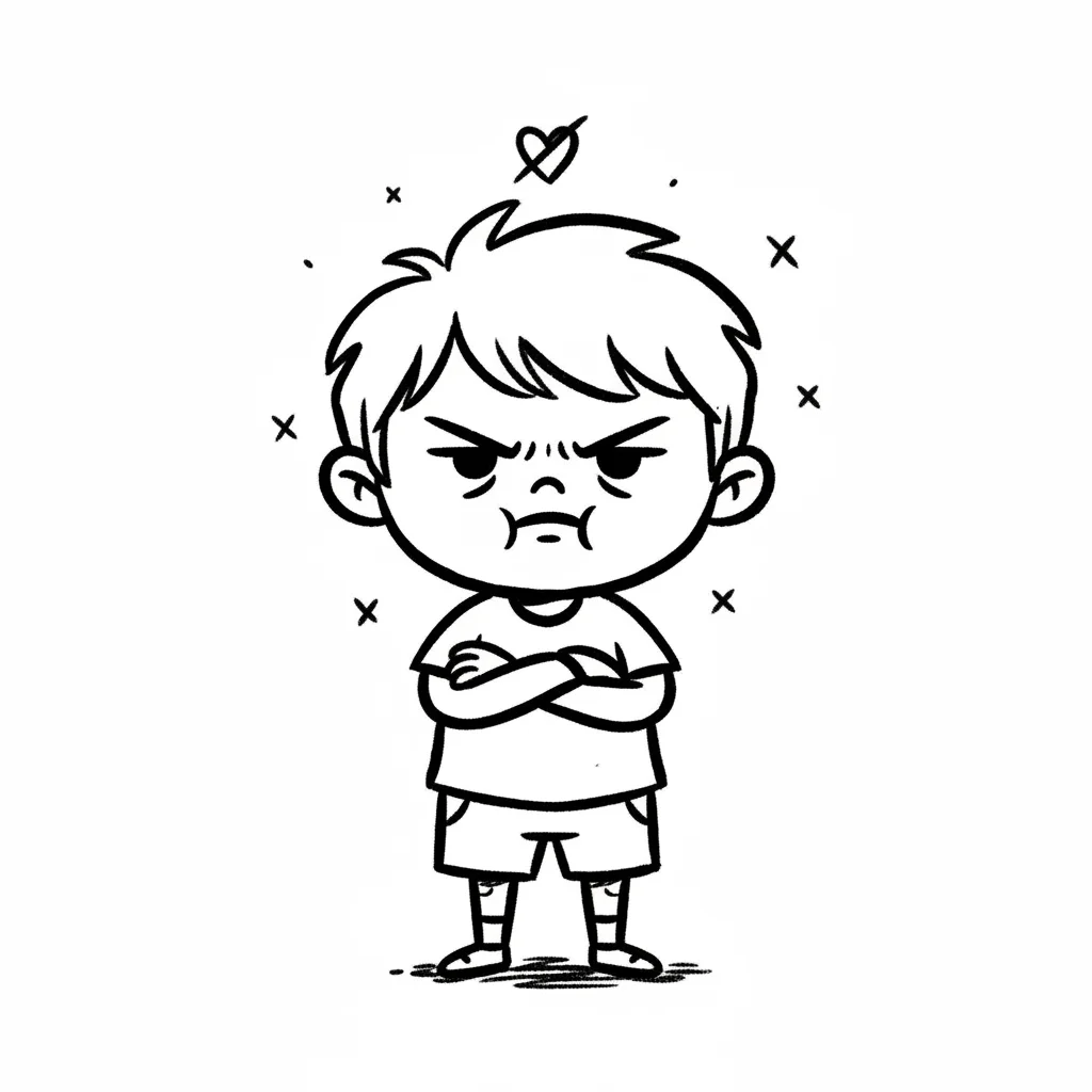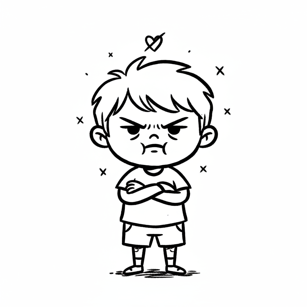 Schwarz-weiße Cartoon-Zeichnung eines wütenden Jungen mit verschränkten Armen und Stirnrunzeln.