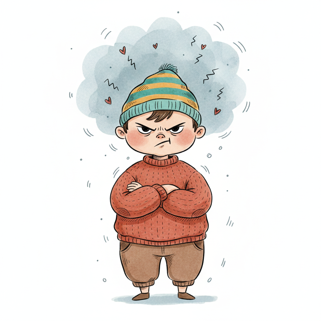 Ein wütender kleiner Junge mit verschränkten Armen und finsterem Blick, umgeben von Ärger-Symbolen.