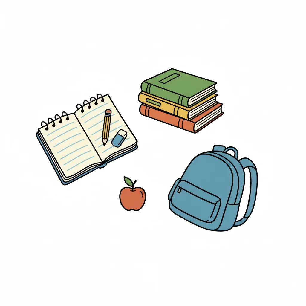 Schulmaterial: Notizbuch, Bücher, Apfel und Rucksack.